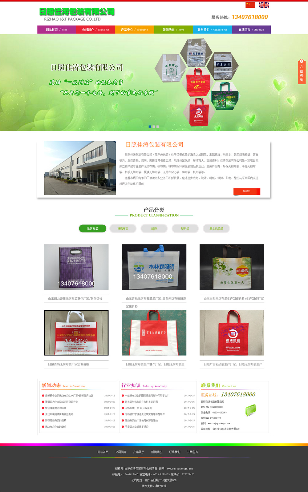 • 日照佳濤包裝有限公司(原千色包裝)位于風(fēng)景優(yōu)美的海濱之城日照,東隔黃海,與日本、韓國隔海相望,西靠臨沂,北連青島、濰坊,南接江蘇省連云港,地理位置優(yōu) 越,環(huán)境宜人,交通 便利。佳濤包裝有限公司是一家在日照成立較早的生產(chǎn)無紡布袋,帆布袋,棉布袋等環(huán) 保包裝制品的企業(yè),主要產(chǎn)品有:環(huán) 保無紡布袋、手提無紡布袋、扣手無紡布袋、覆膜無紡布袋、無紡布背心袋、棉布袋、帆布袋等。
