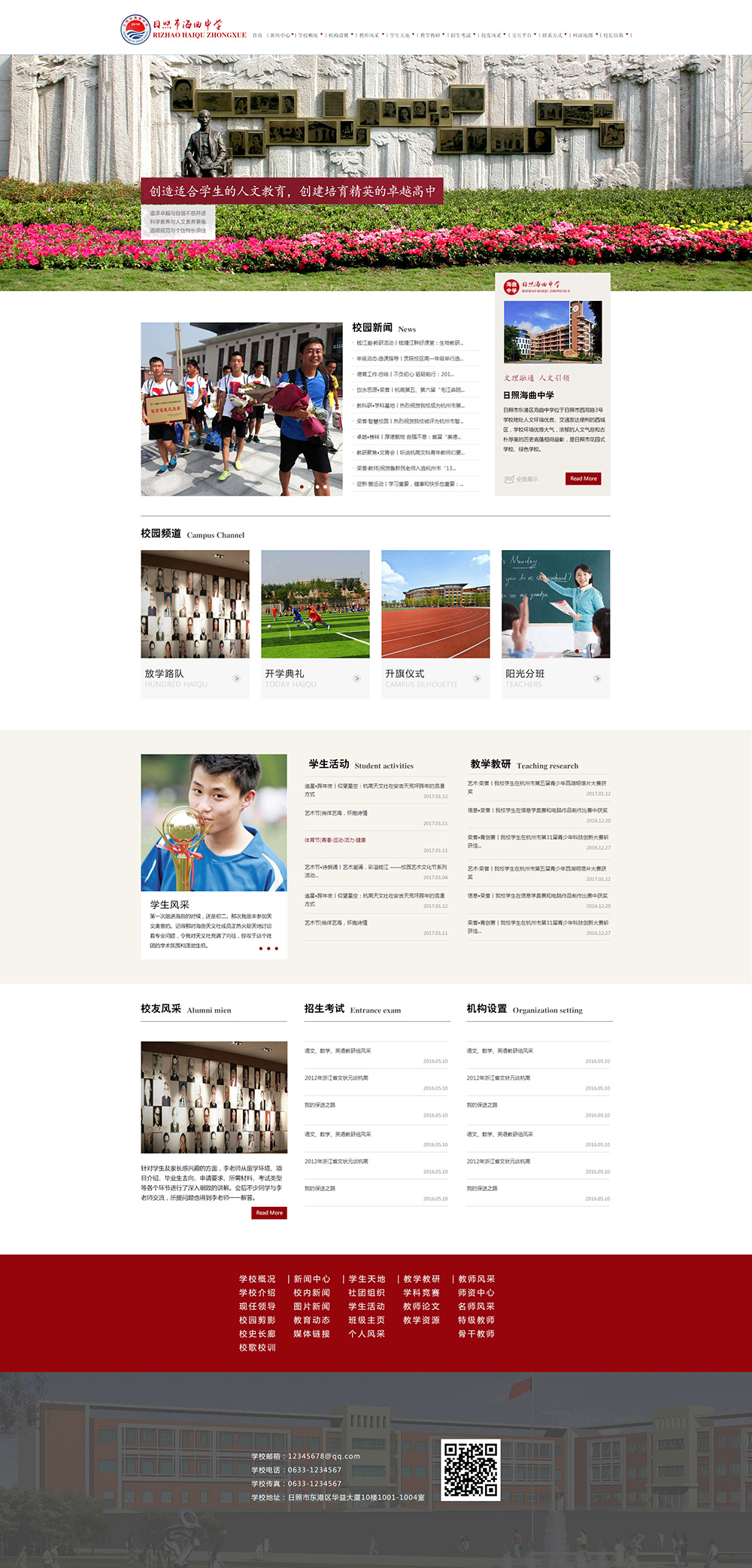 • 日照海曲中學(xué)的前身為日照第四中學(xué),學(xué)校創(chuàng)建于1978年,地處人文環(huán)境優(yōu)良、交通發(fā)達(dá)便利的西城區(qū),占地67.5畝,建筑面積3.1萬平方米。學(xué)校先后榮獲“山東省規(guī)范化學(xué)?!?,“山東省依法治校示范學(xué)?!?、“山東省綠色學(xué)?!?、“山東省體育傳統(tǒng)項目學(xué)校”、“山東省教育工會先進(jìn)集體”、日照市辦學(xué)水平優(yōu)秀學(xué)?!钡?0多項榮譽。幾十年來,學(xué)校培養(yǎng)了大批優(yōu)秀人才,為日照城區(qū)高中教育做出了較大的貢獻(xiàn),有著良好的社會聲譽和群眾口碑。 為了促進(jìn)城區(qū)義務(wù)教育學(xué)校均衡發(fā)展,讓西城區(qū)孩子享受到更優(yōu)質(zhì)的教育,學(xué)校被東港區(qū)確定為2016
