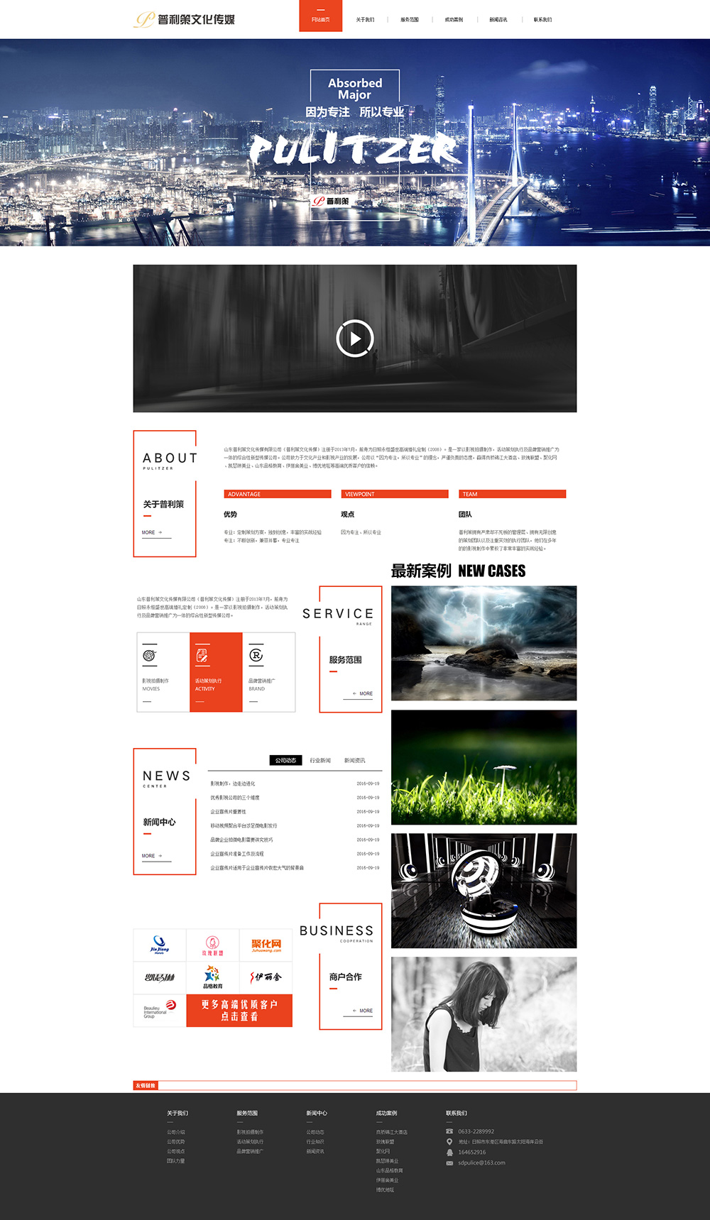 • v山東普利策文化傳媒有限公司(普利策文化傳媒)注冊(cè)于2013年7月,前身為日照永 恒盛世高 端婚禮定制(2008)。是一家以影視拍攝制作,活動(dòng)策劃執(zhí)行及品牌營(yíng)銷推廣為一體的綜合性新型傳媒公司。公司下置:策劃部,市場(chǎng)部,影視部及設(shè)計(jì)部四個(gè)部門。注冊(cè)3年來(lái),致力于文化產(chǎn)業(yè)和影視產(chǎn)業(yè)的發(fā)展,公司以“因?yàn)閷?注,所以專 業(yè)”的理念,嚴(yán)謹(jǐn)負(fù)責(zé)的態(tài)度,獲得了廣大 客戶的贊許和好評(píng)。